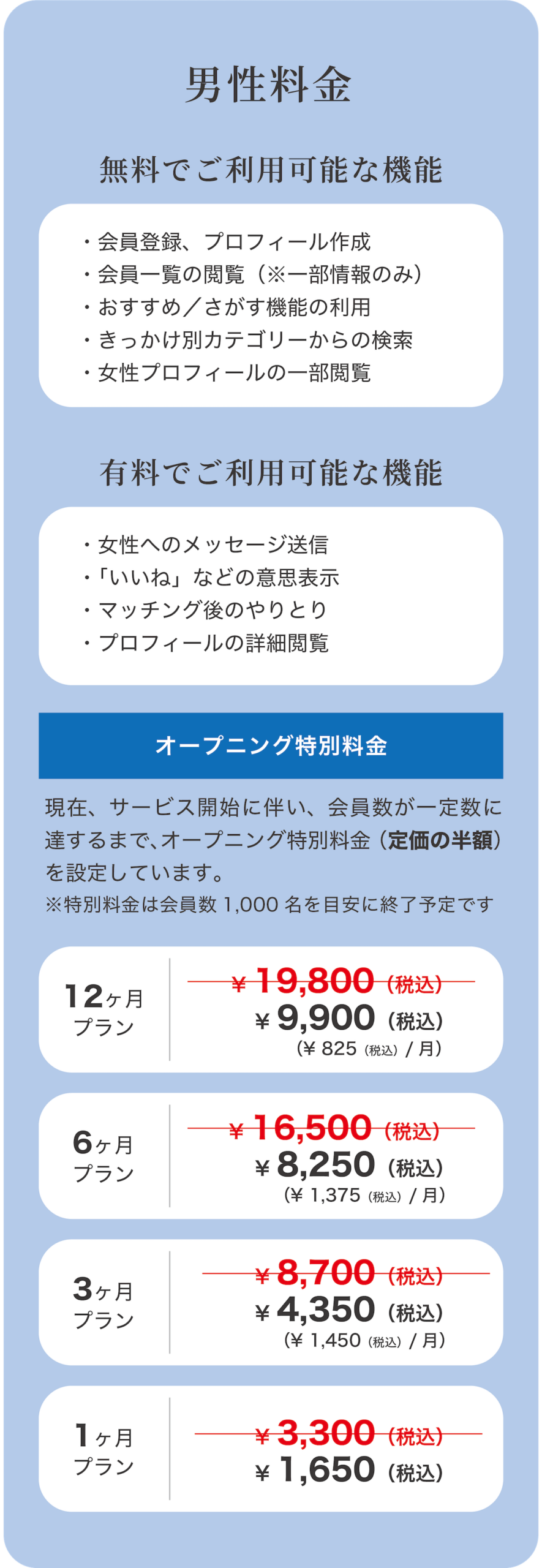 A.会員登録およびプロフィール作成は、男女ともに無料です。女性は、すべての基本機能を無料でご利用いただけます。男性は、女性とのメッセージのやりとりを始める際に、有料会員への登録が必要となります。